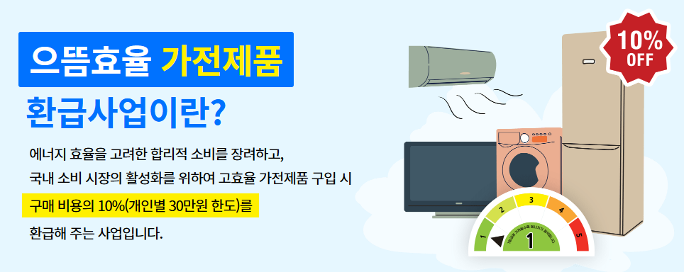 예를 들어 100만 원짜리 에너지 효율 1등급 냉장고를 구매했다면, 10만 원의 환급금을 받을 수 있습니다.