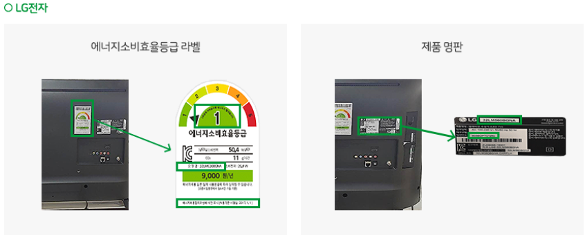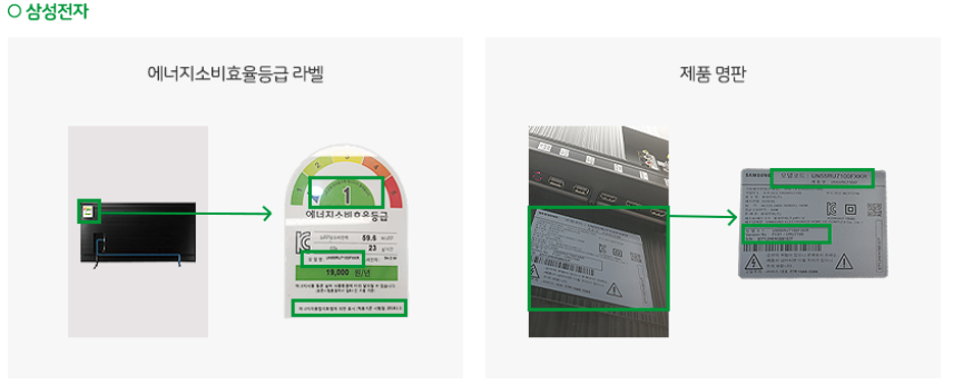 필수 서류는 구매 내역서(영수증), 에너지 소비 효율 등급 라벨 사진, 제품 명판(모델명) 사진 등입니다.