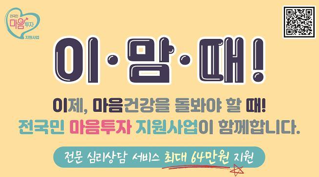 국민 누구나 마음이 힘들 때 도움을 받을 수 있는 ‘전국민 마음투자 지원사업’이 시작되었습니다.