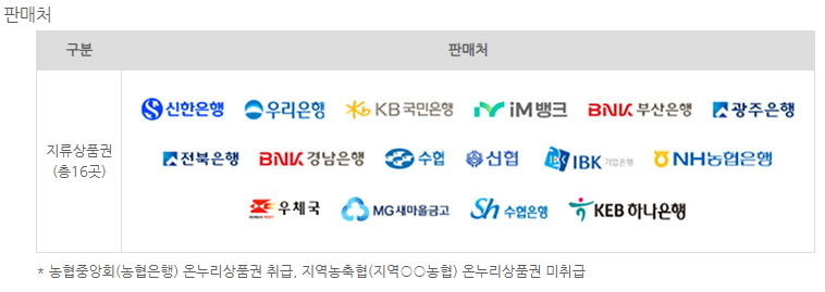 판매처는 전국 주요 은행 지점 중 농협중앙회(농협은행) 및 아래의 금융기관에서 가능합니다.